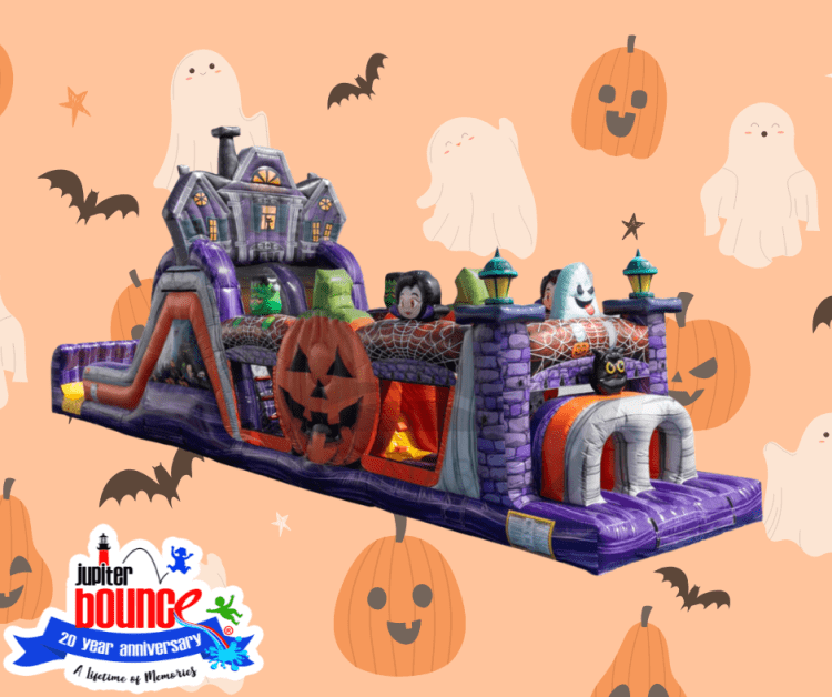 The 50ft Halloween Obstacle Course is highly recommended for ages 6 and up because the ladder for the slide inside the obstacle course is easier to climb than other options!🤩 This awesome unit is very inclusive for kids of all ages and abilities! This piece is one of our most space-friendly obstacle courses! Coming in at 50’ 📏long, it even fits in most Abacoa and Alton yards!🌴 If you are looking for an option that is good for pavement, we suggest the Castaway or the Palm Springs!😊